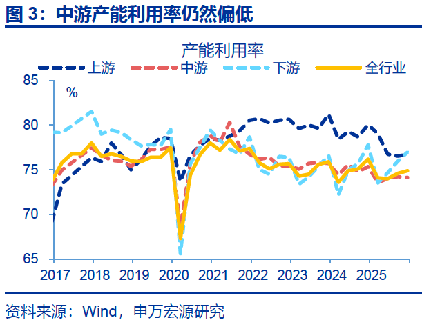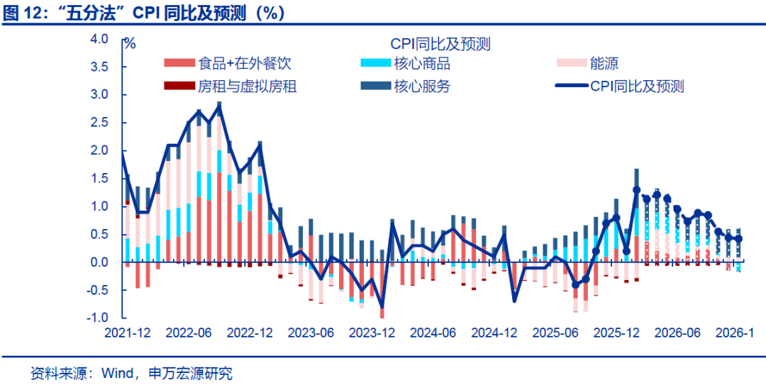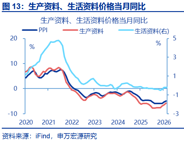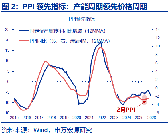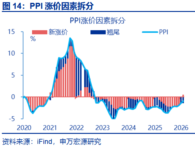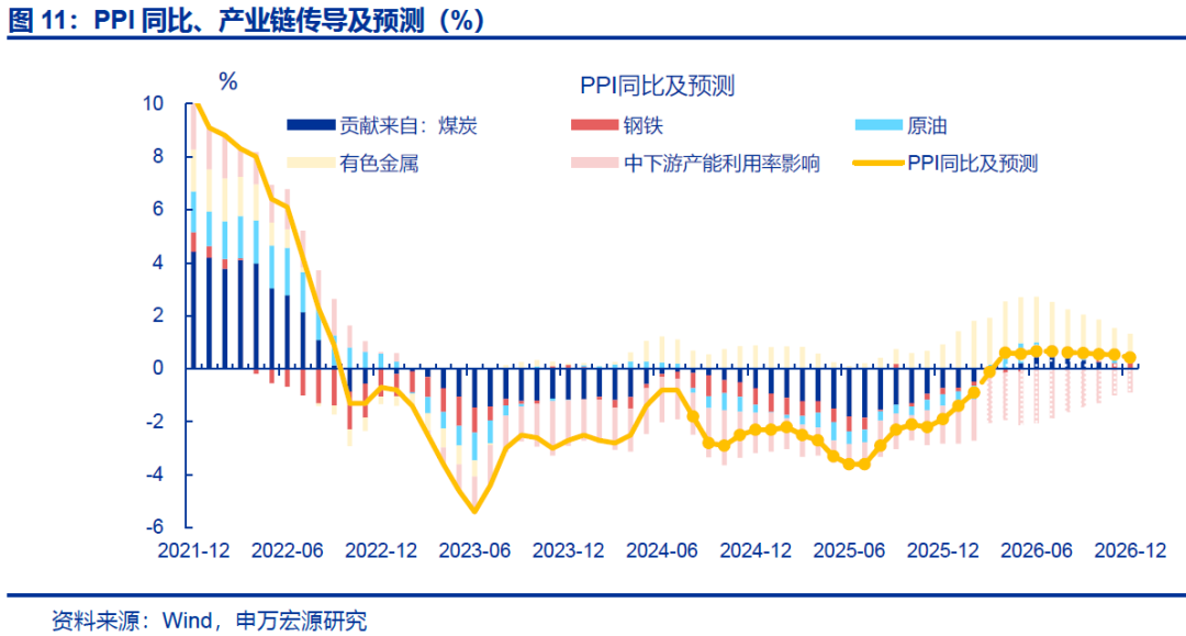 相比之下,中下游产能利用率偏低下,中下游PPI表现仍维持弱势。2025年四季度中下游固定资产周转率同比走弱,或仍约束上游涨价对下游PPI的拉动效率,测算中下游拖累PPI环比-0.2%。其中,医药、食品、汽车等行业PPI环比分别为-0.6%、-0.5%、-0.2%。