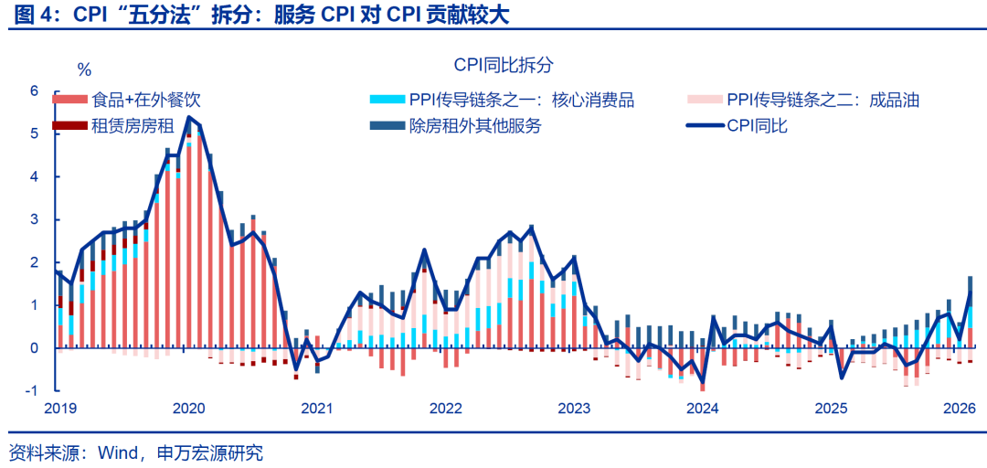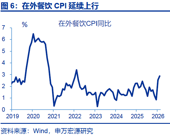 2月CPI明显回升,主因春节错位及服务CPI“超预期”上行。2026年春节与2025年形成错位,导致2月CPI在低基数的影响下,同比较前月回升1.1个百分点至1.3%。拆分结构看,服务CPI走强,环比(1.1%)明显好于往年春节当月(0.8%)。其中,核心服务CPI表现较强,飞机票、交通工具租赁等价格分别上涨31.1%、24.7%。在外餐饮CPI延续回升、同比上行0.3个百分点至2.9%。服务CPI中最大单项是锚定房租变化的虚拟房租CPI受租房需求影响较大,目前租房需求较弱令2月房租CPI同比回落0.1个百分点至-0.5%。