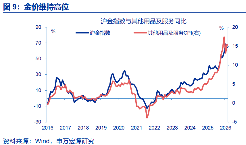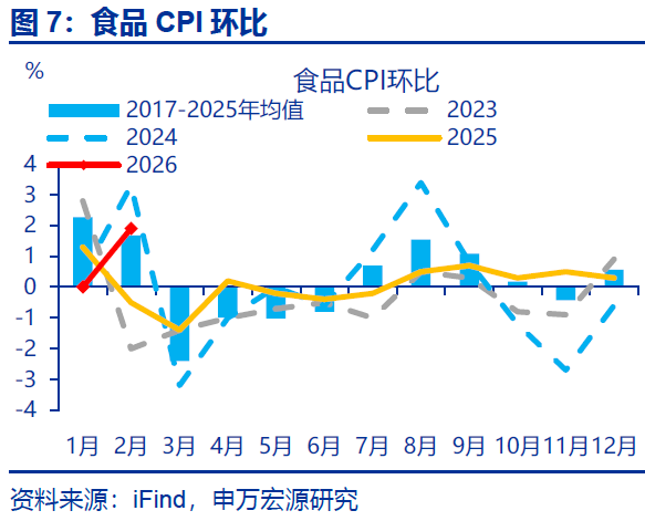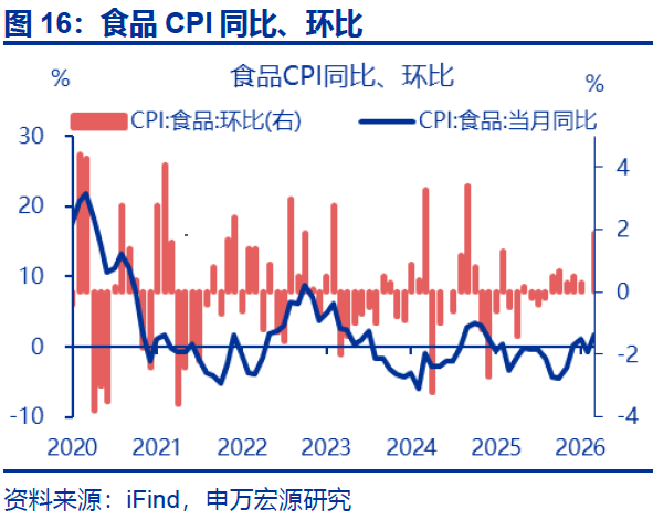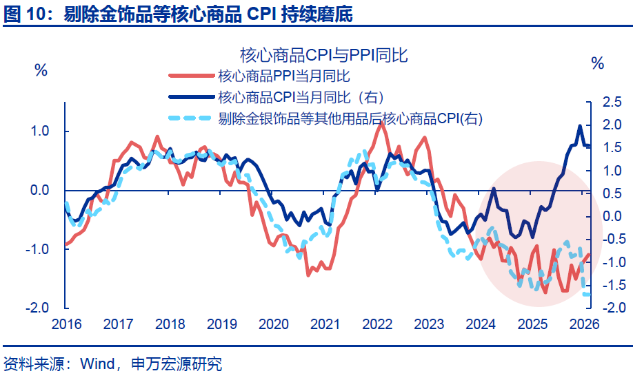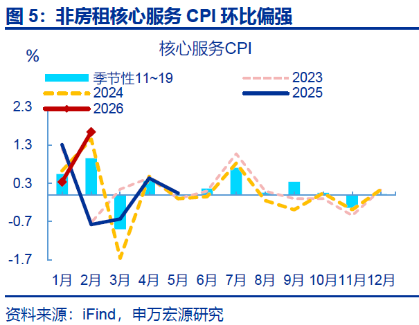 相比之下,食品、核心商品CPI表现均偏弱。2月,受春节错位影响,食品CPI同比上行2.4个百分点至1.7%,食品CPI环比1.9%、不及往年春节当月表现(2.7%)。其中,鲜菜、鲜果、猪肉CPI环比分别-0.1%、4%、4%,均不及往年春节当月;但水产品CPI大幅上行。核心商品CPI同比持平前月(1.6%)。拆分结构看,2月核心商品CPI环比0.1%,主要仍是受金价影响。但剔除金饰品后的其余核心商品CPI同比仍在磨底、同比持平于-1.7%。结构上家电、衣着CPI同比均有回落。
