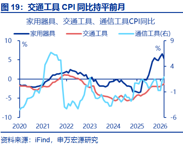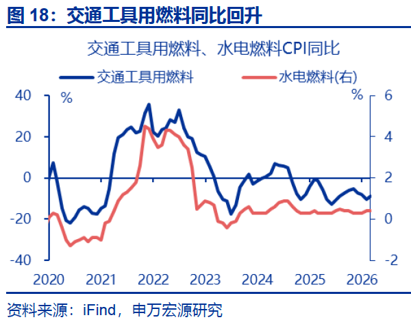 消费品CPI:交通工具、通信工具、交通工具用燃料CPI均有所回升。非食品中,交通工具、通信工具CPI均有所回升,边际分别上升0.3、0.6个百分点至-1.2%、1.9%;家用器具CPI有所回落,同比下行1.3个百分点至5.3%。交通工具用燃料CPI同比上行1.4个百分点至-9.0%,有所回升,水电燃料CPI同比持平前月(0.4%)。