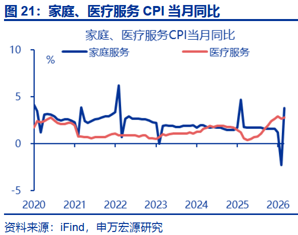 服务CPI方面,整体服务CPI上行,家庭服务CPI增幅明显。2月,整体服务CPI同比边际上行1.5个百分点至1.6%。具体分项看,教育服务CPI同比持平前月(0.5%),家庭服务CPI同比回升6.1个百分点至3.8%,增幅明显,医疗服务同比回升0.1个百分点至2.8%。